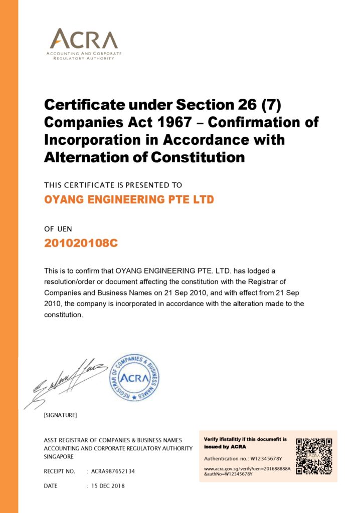 UEN No: 201020108C issued by Accounting And Corporate Regulatory Authority OYANG ENGINEERING PTE. LTD. The company current operating status is live and has been operating for 15 years. This Company’s principal activity is environmental engineering design and consultancy services.